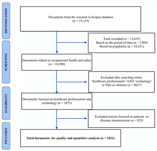 - Identification: in this step, the terms were chosen and the Boolean operators “AND” and “OR” were used. The search query was the following: (TITLE-ABS-KEY (technology OR “social media” OR “Mobile applications” OR “Education, Distance”) AND TITLE-ABS-KEY (“occupational health” OR “occupational safety”) AND TITLE-ABS-KEY (“Health Personnel”)) OR (TITLE-ABS-KEY (technology) OR TITLE-ABS-KEY (“social media”) OR TITLE-ABS-KEY (mobile) OR TITLE-ABS-KEY (“e-learning”) OR ABS (“e-learning”) OR TITLE-ABS-KEY (online)) AND (TITLE-ABS-KEY (health) OR (TITLE-ABS-KEY (“occupational safety”)) OR (TITLE-ABS-KEY (“healthcare workers”))) AND (TITLE-ABS-KEY (prevention) OR TITLE-ABS-KEY (safeguard)). This strategy was developed to identify the number of published items in which title, abstract, or keywords were included the terms (N = 23,135).