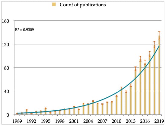 This paper studied the global trend of 1021 research publications regarding ICTs in occupational safety and health of healthcare workers. The results have shown that the publication rate in this topic has increasingly grown from 1989 to 2019, and most publications were from the US and other developed countries. Although the trend of publications increased with the growth of ICTs in the healthcare sector, this trend seemed to highly increase from the beginning of the 2000s, correlating with the popularity and increased development of ICTs in the working environment. The data showed a significant difference between ICTs in OSH in 1989 compared to 2019, which could be related to the revolution of technology [,]. Based on previous work and the current trend linked with the fourth technological revolution, the impact of ICTs in the OSH of the healthcare sector, such as nanotechnology, sensors or virtual reality [,,], might likely have a major impact over the next ten years [].