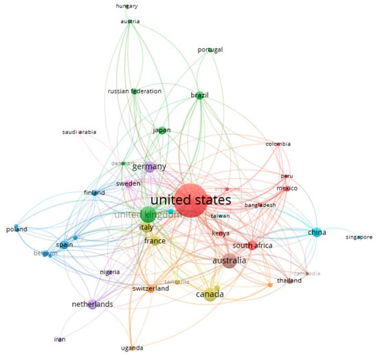Furthermore, a concurrency analysis was carried out to determine possible associations between countries, showing different clusters (Figure 3). Figure 3 shows countries’ collaboration networks between 45 countries, representing the frequency of documents by the size of the circle. The figure represents the nine clusters, with the first, red cluster led by US. The red cluster, with nine countries and 279 links to countries, represents 51.3% of the collaborations between the countries. This cluster is formed by the US (presented in 408 documents), Colombia (five documents), Mexico (11 documents), India (37 documents), and South Africa (presented in 33 documents). The second cluster, in green, represents 18.1% of the collaborations between countries, led by the UK (being in 96 documents and with 36 links to other countries). This cluster was the second in number of countries (eight countries) and links, formed by the UK, Brazil (26 documents), Japan (23 documents), Russia (15 documents), Portugal (eight documents), Austria (six documents), Denmark (six documents) and Hungary (five documents). The third cluster (in blue) reflects 8.1% of the collaborations between the countries, being formed by seven countries. This cluster was led by Spain (presented in 26 documents and with 16 links to different countries), followed by Belgium (15 documents and 15 links), Finland (14 documents and 19 links), Poland (nine documents and four links), Turkey (eight documents and 13 links), Ireland (six documents and six links) and Greece (five documents and four links). The fourth cluster (yellow), represents 8.1% of the collaboration and formed by five countries, which leader Canada (presented in 65 documents and with 17 links to different countries), followed by Italy, France, Norway, and Tanzania. The following cluster in purple, represents 5.2% of the collaborations, formed by four countries with Germany as the leading country (presented in 50 documents and with 17 links to different countries), followed by Iran, Netherlands, and Nigeria. The next cluster (light blue) was formed by four countries (China, Singapore, South Korea and Singapore) was led by China (presented in 35 documents and with 15 links). The seventh (orange) and eighth (brown) clusters were formed by three countries each. The final cluster (pink) was formed by two countries, Sweden (presented in 25 documents and with 24 links to other countries) and Saudi Arabia.