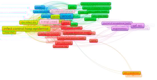 The analysis of the co-citations of journals also showed that these main journals (i.e., Safety Science or Infection Control and Hospital Epidemiology) were linked to other important journals (i.e., The Lancet) and had a major part in the clusters formed, with three (Safety Science, Infection Control and Hospital Epidemiology and BMC Public Health) of the seven leading journals of the cluster among the top ten (Table 5). The mapping (Figure 4) created indicated seven clusters, formed of 160 journals and 4758 links between the different journals. The first cluster (red) was formed by 51 journals, led by Journal of Occupational and Environmental Medicine (J. Occup. Environ. Med.), with 196 citations (Q3 and JCR of 1.64). The second cluster (green) was formed by 35 journals, led by BMC Public Health with 186 citations (Table 5). The third cluster (blue) was formed by 26 journals, led by The Lancet (Lancet) with 508 citations (Q1 and JCR of 60.39), connected to Plos One, which had 253 citations from other journals (Table 5). The fourth cluster (yellow) was formed by 23 journals, led by Infection Control and Hospital Epidemiology (Infect. Control. Hosp. Epidemiol.) with 404 citations (Table 5). The fifth cluster (purple) was formed by 179 journals, led by Safety Science (Saf. Sci.) with 275 citations (Table 5). The sixth cluster (pink) was formed by four journals, led by New England Journal of Medicine (N. Engl. J. Med.) with 225 citations (Q1 and JCR of 74.69). The final cluster (orange) was formed by two journals, led by American Journal of Epidemiology (N. Engl. J. Med.) with 52 citations (Q1 and JCR of 4.53).