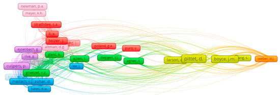 According to the h-index of the top five authors, Mayer, K.H. had more documents and citations, with an h-index of 93, 1187 documents and 45,840 citations. The second author, Brouqui, p. had 464 documents, 14,176 documents and an h-index of 60. The following author was Iavicoli, S. with 245 documents, 2354 citations and an h-index of 27. The last author was Canavati, S.E. with 18 documents, 240 citations and an h-index of 9, whose first document was published in 2011. The author with the highest h-index and documents was from the US, followed by France. The co-citations among authors was analyzed to determine mapping based on the references (Figure 5). The mapping identified seven clusters, with 86 items and 971 links. The first cluster (red) was formed by 21 authors, led by Teizer J., with one document and 62 citations (h-index of 40, 156 documents published and 5443 citations). The second cluster (green) was formed by 19 authors, led by Goetzel R. Z. with no documents and 45 citations (h-index of 40, 182 documents published and 6927 citations). The third cluster (blue) was formed by 15 authors, led by Zohar D. with one document and 46 citations (h-index of 32, 51 documents published and 7048 citations). The fourth cluster (yellow) was formed by 13 authors, led by Pittet D. with one document and 113 citations (h-index of 91, 589 documents published and 35,692 citations). The fifth cluster (purple) was formed by eight authors, led by Cuijpers p. with two documents and 55 citations (h-index of 108, 788 documents published and 41,935 citations). The sixth cluster (pink), was formed by seven authors, led by Altman D.G. with no documents and 40 citations (h-index of 218, 1064 documents published and 352,962 citations). The final cluster (orange) was formed by three authors, led by Weber D.J. with one document and 28 citations (h-index of 64, 443 documents published and 15,845 citations).