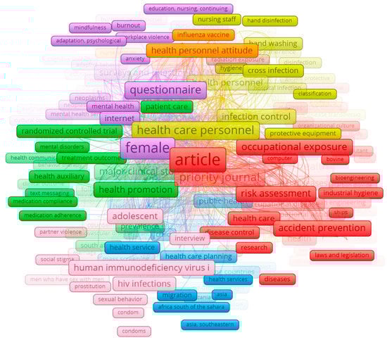 The most common topics in the data were identified using the index keywords of each document (Figure 6). The topics identified eight clusters (formed by 993 keywords with 84,876 links between them). The first and main cluster (formed by 190 keywords) focused on occupational health, prevention of diseases and accidents, and inclusion of ICTs (21.2% of the documents), such as bioengineering (red cluster). This first cluster (red) represented the main sub-topic inside the topic of occupational safety and health linked to ICTs in the healthcare sector. The second sub-topic (green), formed by 172 keywords, represented 18.3% of the sub-topics, focused on viruses and emergency pathologies that affect the global population and therefore were risks. The third cluster (in blue) was formed by 169 keywords and its frequency in the data was 16.8%. This sub-topic was based on workers’ behavior, such as smoking, and mental health, such as stress, burnout syndrome, and physiological support. The fourth cluster, in yellow, represented 16.4% of the sub-topics and was formed by 148 keywords. This cluster has as its main theme the prevention and control of infections and diseases, and correct procedures, such as handwashing and training. The fifth cluster (in purple), formed by 124 keywords and whose frequency in the data was 9.3%, concentrated on the aging of the working population and healthy factors. The six cluster (in pink, formed by 79 keywords and representing 8.2% of the sub-topics) was based on needlestick, hepatitis, devices, and prevention. The seventh cluster (in orange) was formed by 33 keywords and presented 5.1% of the nine sub-topics (clusters), and was centered on cancer, initial detention, and ultraviolet rays. The eighth cluster (in brown), was formed by 18 keywords and had a frequency among the clusters of 4.7%, and was based on insurance, preventive health services, and programs.