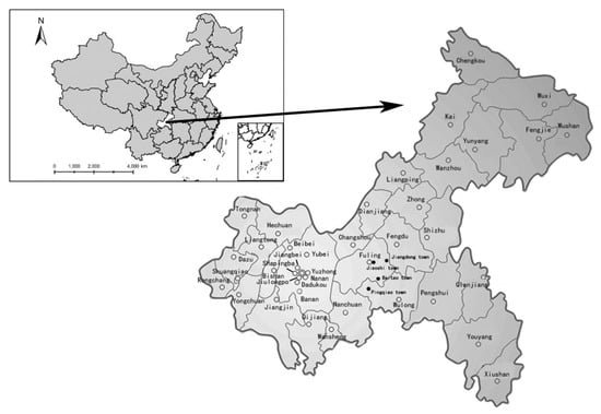Map of the Chongqing Municipality and studied areas (labeled with •).