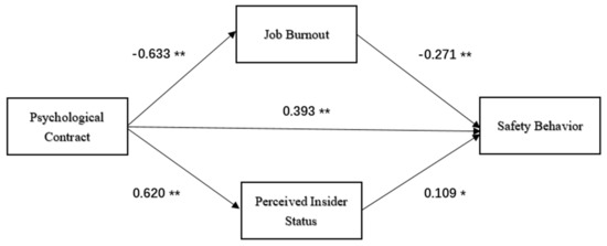 From the above analysis, it can be seen from model 6 that psychological contract has a significant positive impact on safety behavior, and the influence coefficient is 0.629 (p < 0.01); therefore, H1 has been verified. Job burnout has a significant negative impact on safety behavior in model 7, and the influence coefficient is −0.655 (p < 0.01), so H4 was verified. The influence coefficient of psychological contract and job burnout on safety performance is 0.436 and −0.344 (p < 0.01) in model 8, and the effects are significant; that is, job burnout plays a partial mediating role between psychological contract and safety behavior when employees consider the spread of COVID-19 in work resumption, and H2 has been verified. Similarly, according to the results of model 9 and model 10, it can be concluded that perceived insider status also plays a partial mediating role between psychological contract and safety behavior when employees consider the spread of COVID-19; meanwhile, H5 and H7 were verified.