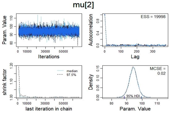 The data were prepared for analyses using Microsoft Excel for office 365 version 16 (Microsoft, Redmond, WA, USA). Thereafter, all statistical analyses were conducted using R package version 3.5.3 (R Core Team, Vienna, Austria) and RStudio version 1.2.5033 (RStudio Team, Boston, MA, USA). The Bayesian estimation of correlation (Bayesian reallocation of credibility across possibilities also known as the Bayes’ rule) was calculated using the Bayesian hierarchical model with Markov Chain Monte Carlo (MCMC) simulation as a part of the model, which is integrated in JAGS package version 4.3.0 (Martyn Plummer, international agency for research on cancer, Lyon, France). However, the Bayes’ rule dictates that the Bayesian estimated correlation has equal probability to fall at any point within the 95% HDI. Therefore, an estimated coefficient (rho = median) would not be enough evidence of association if the 95% HDI overlapped zero [,]. The R code (S1: The R code) provides the complete script, including the model specification and the graphics commands adapted from and adjusted after Kruschke []. The MCMC simulation was carried out by running 3 “chains”, 500 “adapt” steps, 500 steps to “burn-in” and 10th place as a number of “thin” with 20,000 samples to save for each variable in this study []. To apply the model [,,], the data should be reasonably normally distributed and not be too kurtotic []. Therefore, the data were explored through a histogram plot, and the normality of distribution was tested using Shapiro–Wilk’s test, Skewness and Kurtosis (the p value for the Shapiro–Wilk’s test was set to p ≤ 0.05). For the data to be considered too kurtotic, the kurtosis should exceed ± 3 []. The descriptive statistics were reported as Bayesian estimated median ± 95% HDI and standard deviations (SD) ± 95% HDI of the estimated SD median for all the participants on all recorded variables in this study (Table 4). Furthermore, to be able to make an intuitive decision regarding the size of the Bayesian estimation of correlation, Cohen’s effect size for correlation was adapted, where a correlation of 0.1–0.29, 0.3–0.49 and >0.5 were classified as small, medium and large, respectively []. Due to the small sample size, the data produced by the MCMC simulation had to pass several criteria: Firstly, retrospective power analysis using “Posterior predictive checks (PPC)”, which is described in details in [,]. The code for the model check is embedded within the R code (S1: The R code). However, the PPC was qualitatively assessed visually by examining the model and the actual data collected. The figures (S1: The complete correlation figures) show that the superimposed ellipses from the model on the scatter plot of the data effectively contain the data giving a good indication that the model fits the data produced in this study. Secondly, the values of the MCMC chain had to meet the criteria of representativeness and accuracy by examining the convergence of the MCMC algorithm which was checked visually (trace plot and density plot) and numerically (potential scale factor, effective sample size and Monte Carlo standard error) using the approach described by [] (Figure 1; S1: methodological details). Thirdly, the data produced, should be in line with the data reported in the literature regarding the norms of measuring (see Section 4.1.). Fourthly, the relationships between indices of HRV produced in this study should be comparable to the relationships between HRV indices reported in the literature, as it has been shown that this relationship is very stable and remains stable because the SNS and PNS change dynamically.