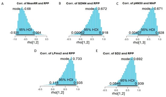 The Bayesian estimation of correlation relocates credibility across possibilities [,,]. Thus, the possibilities are reflected by the 95% HDI, and the probability of the estimated Bayesian correlation falling at any point within the 95% HDI is equal. Based on the Bayes’ rule, an estimated coefficient (rho = median) would not be enough evidence of association if the 95% HDI overlapped zero [,]. Therefore, the findings from this study did not provide enough evidence of the association between the measures of HRV indices and the parameters from the aerobic capacity test (i.e., VO2Peak, BPM, HRmax and Time to exhaustion; Table 6). Nevertheless, the results (Table 6 and Figure 2) indicate a possible association (regardless of the strength) between pNN50% and MAP, MeanRR (ms) and RPP, SDNN (ms) and RPP, LF (ms2) and RPP and SD2 and RPP (Figure 2).