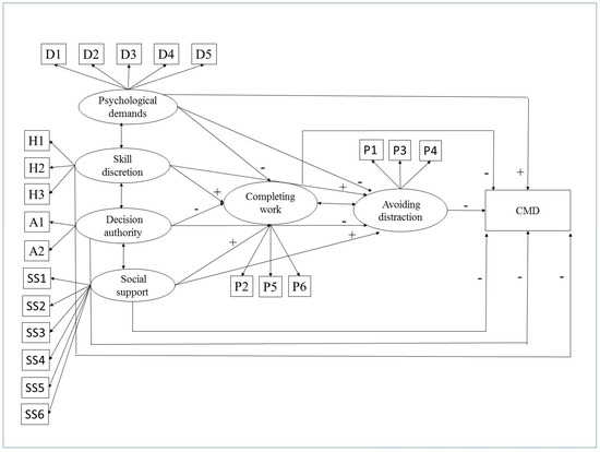 Regarding the mediating role of work impaired by presenteeism, the ability to concentrate on work and not be distracted by health problems mediated the relationship between social support and CMD (−0.040; p = 0.039) and the relationship between psychological demand and CMD (0.048; p = 0.037) (Table 3). The factor loads for the latent variables were positive, with the following values: psychological demands (between 0.503 and 0.738), skill discretion (from 0.418 to 0.702), decision authority (0.699 and 0.710), social support (between 0.387 and 0.783), completing work (from 0.431 to 0.823) and avoiding distraction (between 0.628 and 0.761). The model returned good indices of fit: CFI = 0.93, RMSEA = 0.043 (90%CI: 0.036; 0.050), TLI = 0.91 and SRMR = 0.055. Analysis by job categories showed similar results.