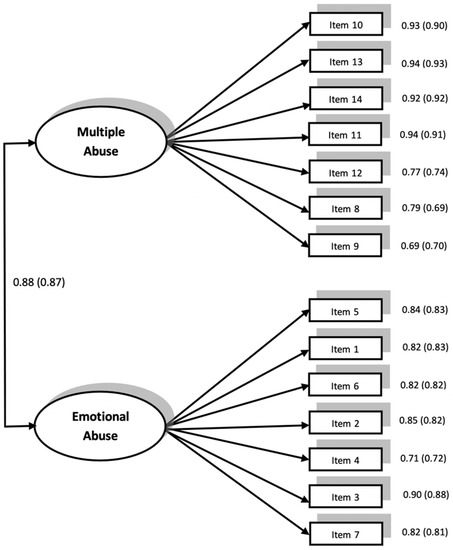 Evidence of internal validity. In Table 3, we see the goodness fit indexes for the two confirmatory models, which were contrasted for the two versions of the questionnaire in the whole sample: unifactorial and two factors related models. In both cases, it can be seen that the consideration of a two factors model provides a better fit than one latent factor alone. Moreover, the two factors model is well adjusted to the data. The two factors correspond to the two types of abuses proposed by Díaz-Aguado [30]: multiple and emotional. In addition, the two types of abuse present a quite high correlation, which implies that the perception of one of the two abuses leads to the perception of the other one as well. In Figure 1, we see the factorial weights of each item, above the two factors with quite high values (between 0.69 and 0.94).