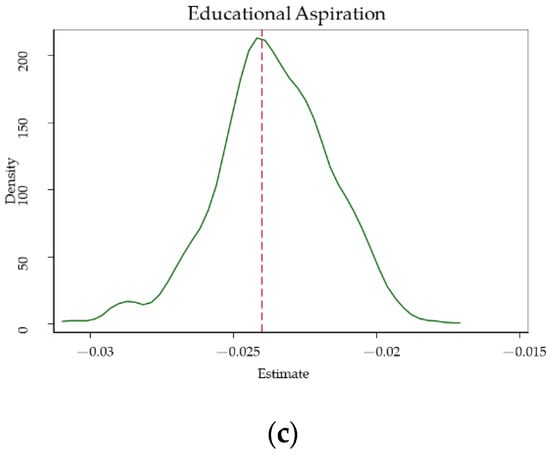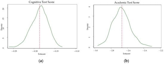 We also follow the approach to conduct a placebo test. Specifically, we check whether the regression results change dramatically if we randomly drop several schools from the baseline sample [31]. To maintain a sufficient sample size, each time we randomly drop two schools from 64 schools, and repeat it 1000 times. Figure 2 shows the probability density distribution of the regression coefficient . The distributions are strictly around their respective baseline estimates. Overall, it shows that our estimations are unlikely to be biased due to containing non-randomly assigned schools.