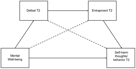 Figure 2. Predicted serial multiple mediation pathway (non-dashed lines) for association between mental well-being and subsequent self-harm thoughts, via defeat and entrapment. Predicted multiple mediation pathway highlighted in non-dashed lines. “T2” indicates data collected at the second time-point. - To establish whether mental well-being moderates the relationship between entrapment and subsequent self-harm thoughts.