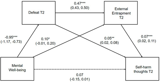 Serial multiple mediation model for the association between mental well-being and prospective self-harm thoughts, via defeat and external entrapment, * p < 0.05; *** p < 0.001 Serial multiple mediation model with unstandardized regression coefficients and 95% bias corrected confidence intervals. Significant pathways are highlighted in bold.