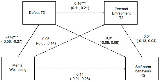 Serial multiple mediation model for the association between mental well-being and prospective self-harm behaviors, via defeat and external entrapment. *** p < 0.001 Serial multiple mediation model with unstandardized regression coefficients and 95% bias corrected confidence intervals. Significant pathways are highlighted in bold.