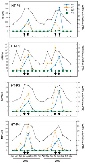 Relationship between the most probable number (MPN) of V. cholerae and V. parahaemolyticus and water temperature measured at the five sampling sites on the HT River. V. cholerae (VC), V. parahaemolyticus (VP), V. vulnificus (VV) and water temperature (WT). Large black arrows indicate an increase in river depth after heavy rain.