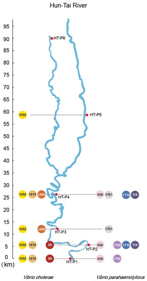Location of V. parahaemolyticus- and V. cholerae-positive sampling sites on the HT River. The V. parahaemolyticus and V. cholerae sequence types in various sampling sites are indicated in the cycles on the left and right side of the rivers, respectively.