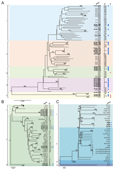 Together with 50 V. parahaemolyticus strains from Liaoning available (pubMLST.org) and 10 isolates collected from Dalian (Table S5), phylogenetic analysis based on concatenated sequences from seven housekeeping genes was conducted. The results showed that 90 strains can be divided into six clusters; V. parahaemolyticus strains from the HT River were distributed across five clusters (Figure 4A), of which ST1761, ST1756, and ST2007 were also identified previously in Liaoning. Phylogenetic analysis of 12 non-O1/O139 V. cholerae strains with 40 strains from the V. cholerae pubMLST database (Table S6) divided them into three clusters (Figure 4B).