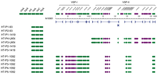 We performed PCR to detect fiveOpen Reading Frame (ORFs) in the VSP-I cluster and eight ORFs in the VSP-II cluster. The results showed that none of the ST1419 strains and ST93 strains carried VSP-I/II clusters (Figure 5). Strains HT-P3-UKN and HT-P4-UKN harbored VSP-II island genes, but none carried a complete VSP-I island. Five ST1092 strains were positive for both VSP-I and VSP-II clusters. The positive PCR products were further sequenced and compared with those of V. cholerae O1 El Tor N16961. For VSP-II in the ST1092 isolates, only 10 ORFs were identified, with 86% (VC0516) to 99% sequence identity with ORFs from V. cholerae N16961. These results indicated that the isolates carried incomplete VSP-I/II types.