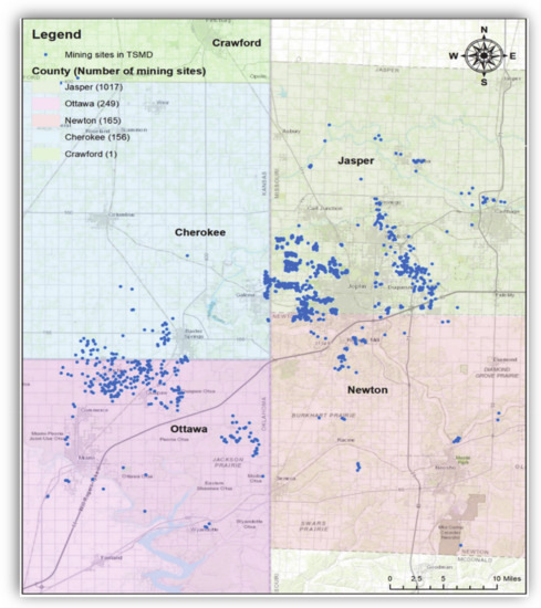 There is a large portion of toxic metal areas, which are called “Superfund” sites by the US EPA [16]. Despite remedial actions, tons of waste materials (in particular, Pb, Cd, and Zn), mining shafts, and tunnels are still left in those areas, which in turn contaminated groundwater and soil [3]. Most of all, the components of Pb and Zn are associated with the geographical location of former mining and smelting centers [3,16]. Figure 2 shows the locations and distribution of the mine-related sites in the TSMD Superfund sites.