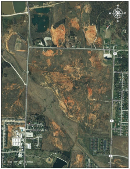 Oronogo-Duenweg Mining Belt Site. Note: The Oronogo-Duenweg Mining Belt Site was one of the major mine waste areas near Joplin, Missouri. The satellite imagery, obtained from Google, shows that the site has left marks (the reddish brown areas) since it was inactive in the 1970s (Date taken: 1 August 2020). The image in the Figure 3 is eligible for the Fair Use of a copyrighted work from Google Map [19].