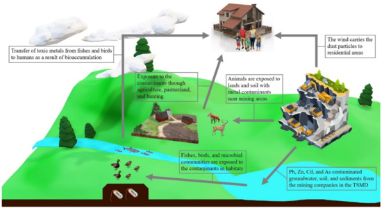 The bioaccumulation of contaminant metals in the TSMD has been detected frequently in various studies. Increased levels of Pb, Cd, and Zn in soils and water in the TSMD severely and negatively impact its environment [3] (Figure 5).