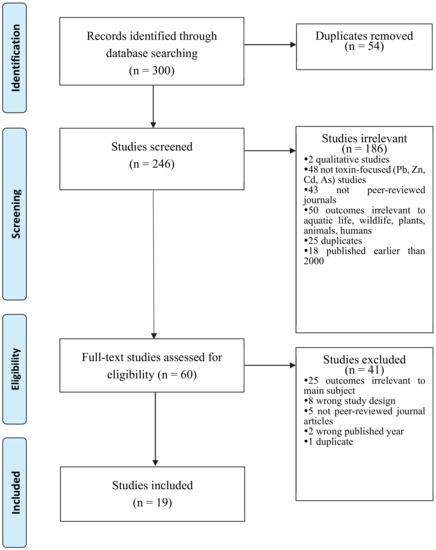 Out of 300 articles identified through database searching, 246 studies were screened after removing duplicates (n = 54). The screened 246 studies initially excluded several articles based on the following reasons: (a) qualitative studies, (b) studies where the main focus is not toxic/toxin, (c) not peer-reviewed journals, (d) outcomes irrelevant to the main subject (e.g., aquatic life, wildlife, plants, animals, humans, ecology), (e) outdated publication (i.e., earlier than 2000), and (f) duplication. After the excluding process, 60 studies were considered eligible. However, the articles underwent another screening process after detecting irrelevant material. The second process of exclusion criteria was (a) wrong outcomes (e.g., remediation effects), (b) wrong study design (e.g., case studies), (c) not peer-reviewed journal articles, (d) wrong published year, and (e) duplication. As a result, 19 studies remained in the sample. Figure 6 shows the creation of the sample of this study.