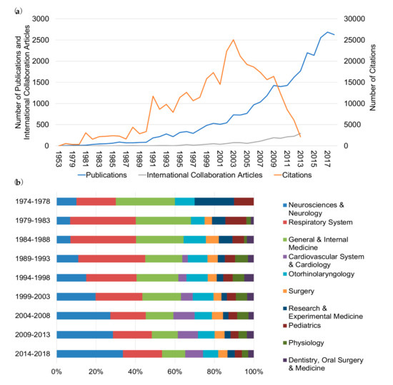The subsequent decrease in the citation count can be accounted for by the fact of less frequent citations/year of the older publications as well as the more recent publications still being in the process of reaching its peak of awareness within the scientific community. This so-called cited half-life (CHL) is a measure of citation survival reflecting the number of years, going back from the current year, that cover 50% of the citations in the present issue of the journal [31,32]. Between 1900 and 2018, OSA articles were published in 90 different subject areas, with the majority originating from Neurosciences and Neurology (N&N; PUB = 9345), followed by Respiratory System (RS; PUB = 6959), and General and Internal Medicine (G&IM; PUB = 4706) (Figure 1b; Table S2). From 1974 to 2018, we observed a significant increase of the contribution from N&N (from 10 to 34%) and Cardiovascular System and Cardiology (from 3 to 9%), to the detriment of G&IM and RS (Figure 1b).