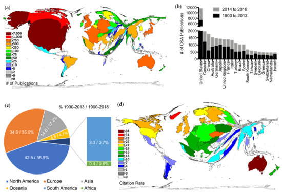 Global OSA research performance. (a) Density equalizing map projection of the number of OSA-related publications between 1900 and 2013. A distorted picture of the world map was generated, and the sizes of the countries were determined by their total number of OSA-related publications. (b) Top 20 countries in terms of total number of OSA publications between 1900 and 2018; black: publication count from 1900 to 2013; grey: additive publication count from 2014 to 2018. (c) Distribution of the global OSA publication output between 1900 and 2018 by continent. Numbers indicate percentage of continents for the period 1900–2013/percentage for the period 1900–2018 (% 1900–2013/% 1900–2018). Antarctica with 0 publications not displayed. (d) Density equalizing map projection of the OSA-related country-specific citation rate for the period 1900–2013. A distorted picture of the world map was generated, and the sizes of the countries were determined by their country-specific citation rate (only countries with ≥30 OSA-related articles).