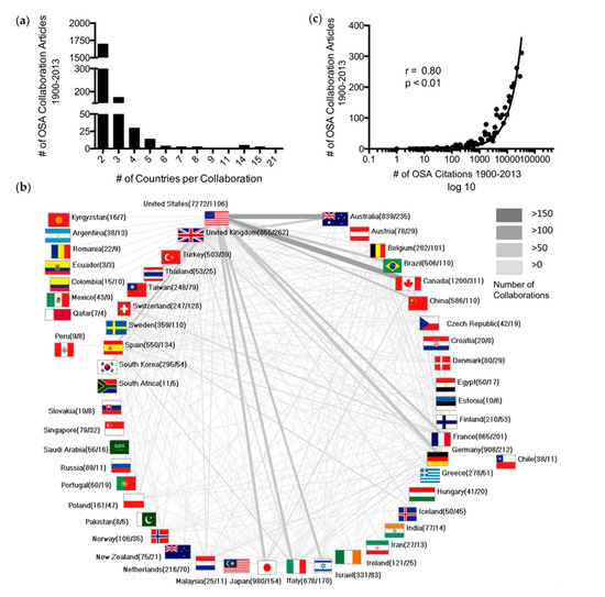 The USA was the center of the international OSA arena (ICA = 1106), and collaborated most frequently with Canada (n = 129), Australia (n = 113), and Germany (n = 84) (Figure 3b). Furthermore, a significant correlation (p < 0.001, r = 0.8) between the countries’ OSA citations and ICA was observed (Figure 3c).