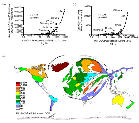 A significant correlation was revealed between the country-specific OSA publications (January 2008–31 December 2018) and the overall publications of all journals listed in WoS between January 2008 and 31 October 2018 (r = 0.85, p < 0.001) (Figure 4a) [25].