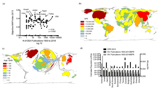 Epidemiological influences. (a) Correlation between the country-specific OSA publication output between 1900 and 2018 and objective multivariable apnea risk index (objective MAP Index) in 2013 (only countries ≥300,000 inhabitants) [26,27,28,29]. (b) Density equalizing map projection of the estimated population at risk of OSA in 2013 (total number of the countries’ obese, male population, age 40 to ≤69 in 2013; only countries with ≥300,000 inhabitants) [30]. A distorted picture of the world map was generated, and the sizes of the countries were determined by the distribution of their estimated population at risk (EPR) in 2013. (c) Density equalizing map projection of the ratio R3 (OSA publication output between 1900 and 2013/estimated population at risk per 100,000 in 2013 for countries with ≥300,000 inhabitants). A distorted picture of the world map was generated, and the sizes of the countries were determined by their respective ratio R3 [30]. (d) Comparison of the country-specific ratios R3 (OSA publication output 1900–2018/estimated population at risk) and R4 in relation to the estimated population at risk. Displayed are the top 15 countries in terms of country-specific ratio R3. Black: estimated population at risk in 2013; grey with black fill: country-specific ratio R3; grey: country-specific ratio R4.