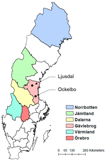 Figure 1. Six counties in Sweden, which fully or partly cover previously-identified high-risk sites for tularemia, and are the cases for future disease projections in the present study.