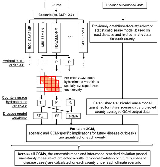 Figure 2. Schematic diagram of the model and statistical analysis approach in this study. For each county, we selected daily outputs of disease-relevant hydroclimatic variables (related to air temperature T, precipitation P, and runoff R) for the grid cells of each global climate model (GCM) with at least 40% of their area located within each targeted county (35% for Örebro county in The Geophysical Fluid Dynamics Laboratory’s Earth System Model version 4 (GFDL-ESM4) and The Geophysical Fluid Dynamics Laboratory’s climate model version 4 (GFDL-CM4)). We spatially averaged the values of each hydroclimatic output variable of each GCM over these county grid cells to represent a corresponding county-average daily hydroclimatic variable value (air temperature Tc, precipitation Pc, and runoff Rc). Furthermore, for each GCM, we assessed its hydroclimatic projection implications for the future scenario evolution of disease cases in each county, based on a previously established county-relevant statistical disease model that we quantified by preceding-year number of disease cases and relevant GCM-projected county-average hydroclimatic variables (including summer temperature in the preceding year STlag, summer precipitation in the same year SP, and standardized relative annual mosquito abundance sRMA, which is in turn related to various river flow Q conditions). Finally, across all GCMs, we calculated the model ensemble mean and inter-model standard deviation (as a GCM uncertainty measure) of scenario-implied possible future evolution of disease cases in each county. SSP1-2.6: Shared Socioeconomic Pathways (SSP) with emissions driven by sustainable practices to produce radiative forcing of 2.6 Wm−2 by 2100; BCC-CSM2-MR: The Beijing Climate Center Climate System Model, Version 2-MR; MRI-ESM2-0: The Meteorological Research Institute Earth System Model, Version 2.0; NorESM2-MM: The Norwegian Earth System Model, Version 2-MM.