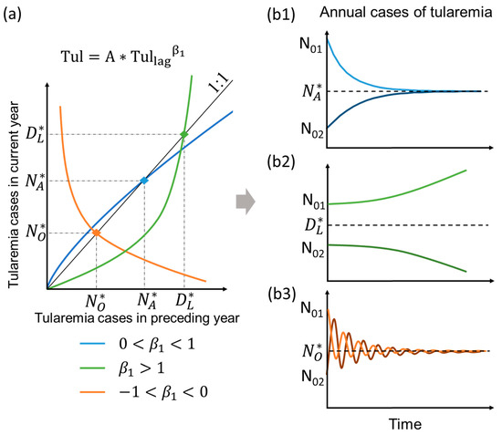 Figure 3. Conceptual diagram of: (a) different types of power-law scaling of number of tularemia outbreaks in a year (Tul) with the preceding-year number of outbreaks (Tullag); and (b1b3) the associated evolution of Tul with time. The curve intersections with the black 1:1 line at Tul = Tullag = N A , D L , N O in (a) represent endemic convergence level (dashed line in (b1)), divergence level (dashed line in (b2)), and endemic convergent oscillation level (dashed line in (b3)), respectively, for Tul after a shift in long-term average hydroclimatic conditions from a initial Tullag level larger (N01) or smaller (N02) than N A , D L , N O (i.e., in A of the best-fit power-law scaling Tul = A Tul lag β 1 for different exponent β 1 cases of relevance for the Swedish study counties (Table 1).