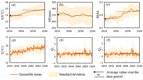 Figure 4. Projected ensemble mean results (orange line) ± 1 inter-model standard deviation (shaded areas) for the example of Dalarna county under the CMIP6 climate scenario SSP2-4.5. (a) Summer temperature (ST, °C), (b) summer precipitation (SP, mm), (c) standardized relative mosquito abundance (sRMA), (d) mean temperature (T) over 1–7 days before time t of the sRMA evaluation, along with maximum standardized river flows (e) Q1 and (f) Q2 over 36–42 days and 22–28 days before t, respectively. Results are shown in terms of 20–year running averages in (ac), and in terms of annual average values in (df). Black lines show average values over the time periods 2015–2057 and 2058–2100. Supplementary Figures S1 and S2 show results for all counties corresponding to panels (ac) and (df), respectively.