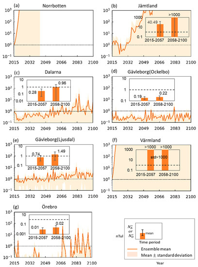 Figure 5. Normalized projected ensemble mean number of annual tularemia cases (nTul) for 2015–2100, and (inserts) associated normalized endemic levels ( N A or N O ) for the periods 2015–2057 and 2058–2100. Results are shown for the Swedish counties Norbotten (a), Jämtland (b), Dalarna (c), Gävleborg (two sites) ((d) and (e)), Värmland (f), and Örebro (g) under CMIP6 climate scenario SSP2-4.5. The shaded areas (main figures) and error bars (inserts) show ± 1 inter-model standard deviation around the model ensemble mean.