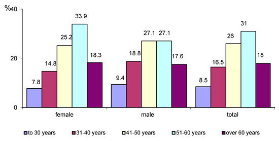 Statistical analysis showed that the level of disease acceptance decreased with age (p = 0.01). The highest mean score for disease acceptance was reported in the age group of up to 30 years (34.41 points) and in the age group of 31–40 years (33.3 points). The lowest score was determined in the age group of 41–50 (29.63 points) and over 60 (27.67 points).