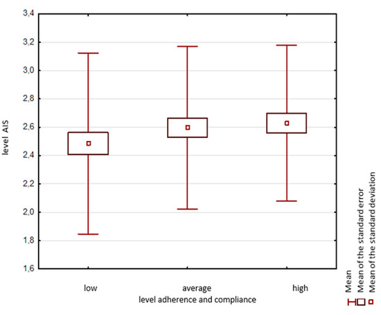 The most numerous group of respondents were people with a moderate level of adherence and compliance—72 individuals (36%). Among the respondents, 66 people (33%) reported a low level and 62 people (31%) reported a high level of adherence and compliance.