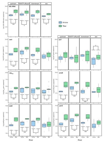 - Proia, L.; Anzil, A.; Subirats, J.; Borrego, C.; Farrè, M.; Llorca, M.; Balcázar, J.L.; Servais, P. Antibiotic resistance along an urban river impacted by treated wastewaters. Sci. Total Environ. 2018, 628–629, 453–466. [Google Scholar] [CrossRef]