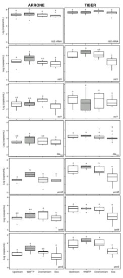 - Cacace, D.; Fatta-Kassinos, D.; Manaia, C.M.; Cytryn, E.; Kreuzinger, N.; Rizzo, L.; Karaolia, P.; Schwartz, T.; Alexander, J.; Merlin, C.; et al. Antibiotic resistance genes in treated wastewater and in the receiving water bodies: A pan-European survey of urban settings. Water Res. 2019, 162, 320–330. [Google Scholar] [CrossRef]