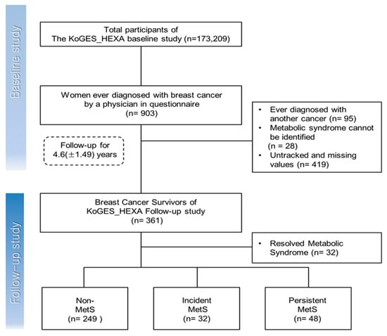 Surviving subjects diagnosed with breast cancer were selected using the definition of the National Convention of Cancer Survivors (NCCS) []. Of the 173,209 participants in the base investigation, 903 women were diagnosed with breast cancer by physicians. However, 95 women with a history of other cancers were excluded from the subjects. After excluding the 28 whose metabolic syndrome could not be determined, and 419 who could not be followed up, 361 women were selected for the base investigation. Depending on whether metabolic syndrome had developed, the subjects were divided into three groups. The “no metabolic syndrome group” did not have metabolic syndrome. The “onset metabolic syndrome group” did not have metabolic syndrome at the time of the base investigation but had developed it by the time of the follow-up survey. The “persistent metabolic syndrome group” comprised patients who had metabolic syndrome from the time of the base investigation until the time of the follow-up survey. Thirty-two women who had metabolic syndrome during the base investigation but were not diagnosed at the time of the follow-up survey were excluded from the analysis. Therefore, 329 subjects were selected, with 249 in the no metabolic syndrome group, 32 in the newly developed metabolic syndrome group, and 48 in the continuing metabolic syndrome group. The average duration of follow-up was 4.6 (±1.49) years (Figure 1).