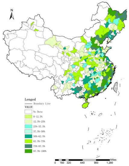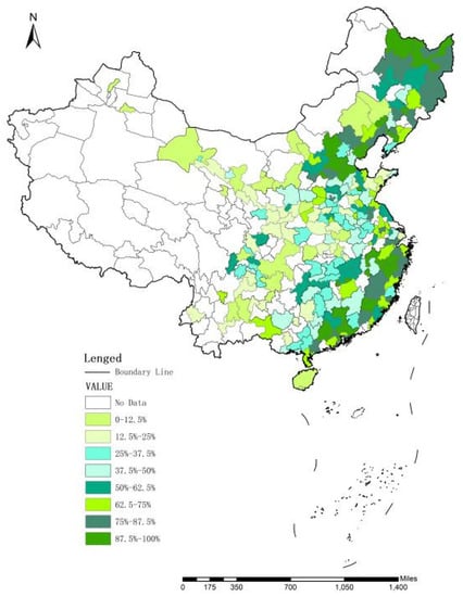 This study employs stable lighting data from 2014 to 2018 for 280 cities in China to measure regional economic development. The Defense Meteorological Program (DMSP) Operational Line-Scan System data are widely used to estimate the population size/electricity consumption and monitor urban expansion. First, night light data are a good data source for research monitoring human activities. Second, stable lighting data can be used not only to test real economic growth but also to measure economic activities such as economic agglomeration, urbanization, population mobility, and energy consumption []. Third, night light data objectively reflect regional differences in the production and living conditions of the society []. Therefore, night light data are an objective measure of urban economic development. However, because the data values are relatively large (i.e., in the whole data range, the sensitivity to differences is greater for lower values than higher values), the logarithms of these values are used instead. This approach compresses the scale of the variables and reduces the absolute value of the data but does not change the nature of the data or the correlation. Additionally, the logarithms are easy to calculate and apply to the models.