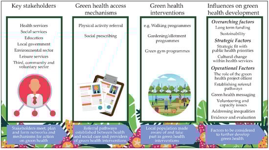 Little is known about the effective establishment of green health referral pathways. Scottish Green Health Partnerships (GHPs) are co-ordinated cross-sector partnerships including a range of organisations from health, social care, transport, education, sport and the environment sectors []. GHP’s aim to encourage use of the natural environment and establish pathways through which green health interventions can contribute to health improvement. Understanding the views of key individuals during the establishment of GHP’s can provide valuable insight into the implementation of green health into referral pathways []. In this study, we differentiated between two key groups of individuals: operational and strategic stakeholders. Operational stakeholders refer to those involved in the development and provision of green health interventions, improvements to green health and those who referred into established pathways (e.g., GHP project officers, education and health representatives, local authority environment department employees and leisure trust/third sector providers of referral schemes and interventions). Strategic stakeholders refer to those able to facilitate change at a policy, funding and strategy level (e.g., directors of public health, health and social care leads and community planning partnership leads). This study aimed to explore the views and experiences of a range of professionals involved in the establishment of GHPs, in order to gain insight of the influences on the establishment of pathways to promote green health.