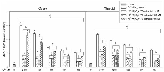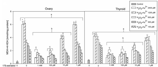 The concentrations of malondialdehyde + 4-hydroxyalkenals (MDA+4-HDA) in ovary and thyroid homogenates. Homogenates were incubated in the presence of FeSO4 (2400, 1200, 600, 300, and 150 µM) plus H2O2 (5 mM) with or without 17β-estradiol (1 mM, 100 µM and 10 µM). Data are expressed as the amount of MDA+4-HDA (nmol) per mg of protein. Bars represent the mean ± SE of three independent experiments run in duplicates. a p < 0.05 vs. control ‘0’ in the same tissue; b p < 0.05 vs. respective concentration of Fe2+ (+H2O2) without 17β-estradiol; c p < 0.05 vs. respective concentration of Fe2+ (+H2O2) + 17β-estradiol 10 µM; * p < 0.05 vs. the same substance/concentration in the other tissue.