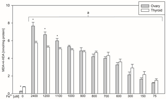 The concentrations of malondialdehyde + 4-hydroxyalkenals (MDA+4-HDA) in porcine ovary and thyroid homogenates. Homogenates were incubated in the presence of FeSO4 (2400, 1200, 1100, 1000, 900, 800, 700, 600, 300, 150, and 75 µM) plus H2O2 (5 mM) used to induce lipid peroxidation. Data are expressed as the amount of MDA+4-HDA (nmol) per mg of protein. Bars represent the mean ± SE of five independent experiments run in duplicates. a p < 0.05 vs. control ‘0’ in the same tissue; * p < 0.05 vs. the same concentration in the other tissue.