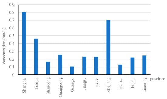 Figure 1 shows the distribution of inorganic nitrogen concentration in 11 coastal provinces. Evidently, Shanghai and Zhejiang have the highest concentrations, while Guangxi and Hainan have the lowest concentrations. Moreover, CCEQB included the water quality assessment results of 11 provinces along the coast of China. The evaluation results over the years have shown that Shanghai and Zhejiang had the worst water quality, while Guangxi and Hainan had the best water quality [