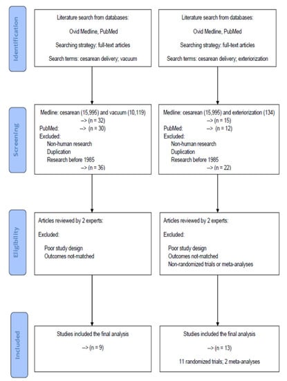 This review was modeled based on the Preferred Reporting Items for Systematic Reviews and Meta-Analyses (PRISMA) statement. All of the articles were retrieved from the databases Medline and PubMed using the search terms “cesarean delivery” and “vacuum” for the assistive method “vacuum assisted cesarean delivery”, and the search terms “cesarean delivery” and “exteriorization” for the surgical technique “uterine exteriorization”. For further screening and selection, only full-text articles were considered to be included for a further analysis.