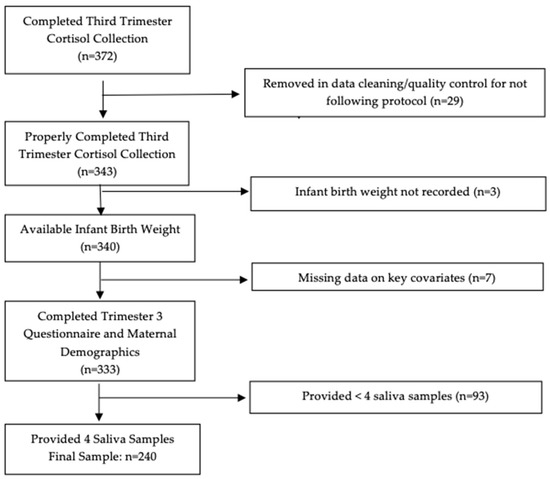 Within the MADRES cohort, 372 mothers completed at-home saliva collections over one day (up to four samples) in their third trimester of pregnancy (sample range: 26–35 weeks gestation). A total of 240 mother–infant dyads with complete maternal cortisol data, birth outcomes data, and key maternal and infant covariates were included in the current analysis. After cleaning the raw data (N = 372) and completing quality control checks to ensure all samples were taken on the same day by individually looking at each mother’s reported times and dates, 343 mothers collected at least one sample according to the protocol (explained in more detail below). Three dyads were then removed for not having recorded birth weight available, seven dyads were removed for missing maternal demographic data and/or key covariates collected in the third trimester questionnaire, and 93 were removed for providing less than four saliva samples on the assessment day, which were needed to calculate the cortisol concentration of AUCg. The consort diagram presenting sample exclusions are shown in Figure 1. Maternal and infant demographic and health characteristics were similar (data not shown) in mothers who properly provided one or more saliva samples across the day (N = 343) to those who completed collection of all four samples across the day (N = 240).