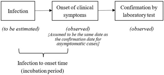 An infected person goes through an incubation period before the onset of the symptoms. The time when the symptoms appear is the onset time. The term “onset cases” was used to refer to the cases with onset of the symptoms on a particular day. There was also a delay between the onset of symptom(s) and the confirmation of cases. Figure 1 shows the temporal relation between infection, onset, and confirmed cases.