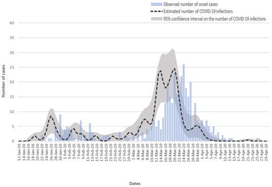 The number of COVID-19 infections over this period was estimated to be 422. Figure 2 gives the estimated daily number of COVID-19 infections, the pointwise 95% confidence intervals on the estimated infection number, and the observed daily number of onset cases for the period from 12 January 2020 to 30 April 2020. It was estimated that the first infection occurred around 18 January 2020, roughly four days after the arrival of the first imported case on 14 January 2020. The highest peak was estimated around mid-March 2020, which was in the middle of the second wave of infection which started in March. Zero infection was estimated since 4 April 2020.