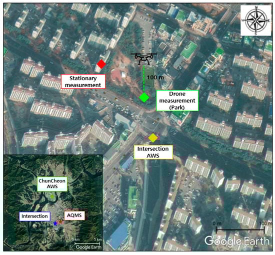 The two periods of interest were on four consecutive weekdays from 12 to 15 March 2019 (P1) and on five consecutive weekdays from 1 to 5 April 2019 (P2). The drone measurements were conducted in the urban park at approximately 50 m north of the center of the intersection. The stationary measurements were conducted on the 11th floor (i.e., 30 m altitude above the ground) of an apartment building at approximately 150 m northwest of the center of the intersection. Two measurement locations were placed at the downwind side of the intersection when a southerly wind prevailed. From 10 min before every drone measurement, we recorded traffic videos of the intersection for two cycles of traffic signals (i.e., 320 s). Then, the traffic volumes were manually counted from the recorded video. Chuncheon automatic weather station (AWS), approximately 5 km North of the Toegye Intersection, is chosen for background meteorological observation data. In addition, AWS instruments were additionally installed on the sidewalk to the south of the Toegye Intersection for roadside meteorological observation data, such as temperature, relative humidity, wind direction, and wind speed. The air quality monitoring station (AQMS) data were obtained for urban background concentrations of air pollutants (i.e., PM2.5, NO2, O3).