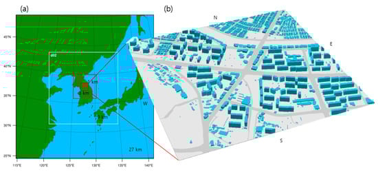 (a) Four nested domains in the WRF model and (b) a CFD model domain including the Toegye Intersection and the surrounding apartment and commercial buildings.